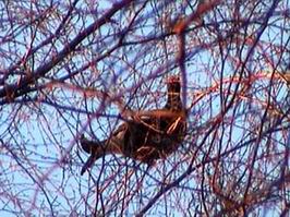 It is like a domestic hen in size. Males (heath-cocks or blackcocks) are bluish-black, with the tail feathers lengthened and bent as a lyre on each side of the tail, with a white bottom of tail and bright red eyebrows. Females are reddish-brown, with fine black painting, a little bit less in size than males.